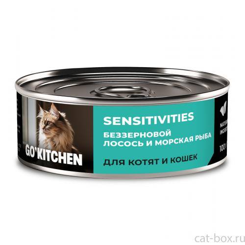 Беззерновые полнорационные консервы для взрослых кошек и котят с чувствительным пищеварением с лососем и морской рыбой GO'KITCHEN SENSITIVITIES Salmon&Seafish отвечают физиологическим потребностям питомцев.
