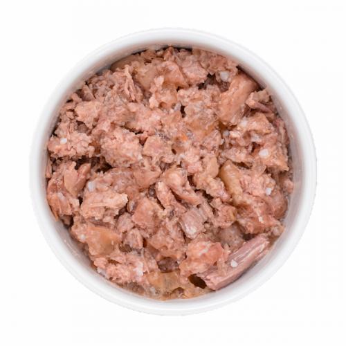 Телятина (мясо теленка, печень теленка) 45%, бульон из кости теленка, треска 10%, лосось 5%, коричневый рис, клюква, льняное семя, подсолнечное масло.