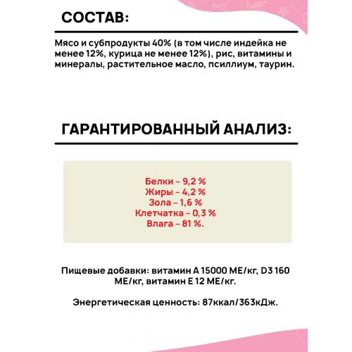 Высококачественный полнорационный сбалансированный влажный корм с индейкой для профилактики и вывода волосяных комочков шерсти из желудочно-кишечного тракта подходит для взрослых кошек старше 12 месяцев.
