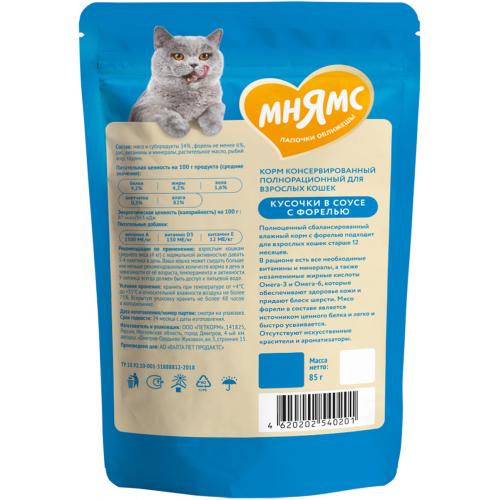 Мнямс Кусочки в соусе с форелью для красивой шерсти кошек пауч, 85г