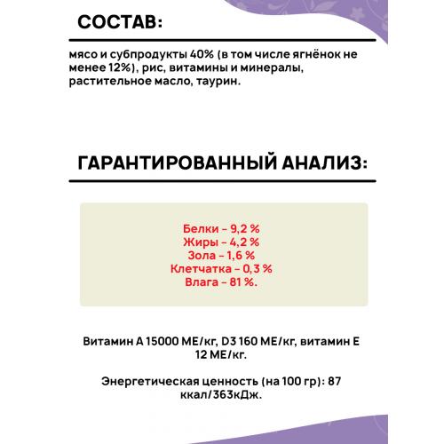 Высококачественный полнорационный сбалансированный влажный корм с ягненком подходит для взрослых активных кошек старше 12 месяцев.
