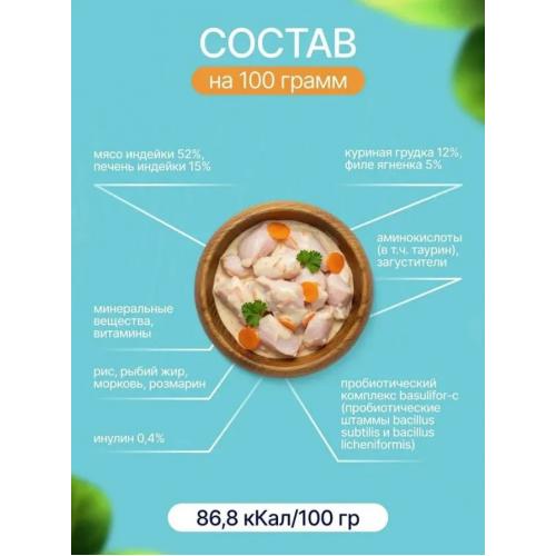 В основе рецептуры — мясо индейки и печень индейки, дополненные куриной грудкой и небольшим количеством ягнёнка. Морковь и функциональные компоненты помогают поддерживать работу ЖКТ, а пробиотический комплекс способствует стабильности микробиоты.