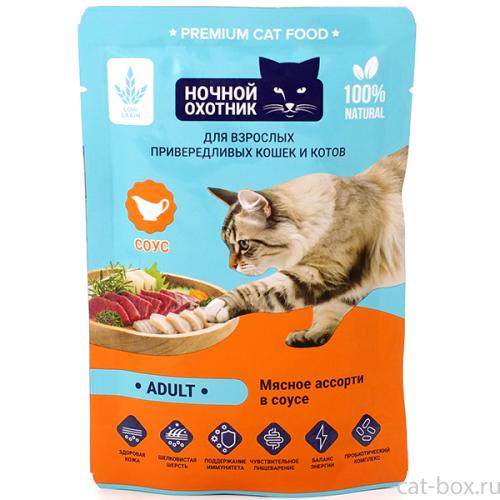 Ночной охотник Паучи ADULT для привередливых кошек Мясное ассорти в соусе, 85г