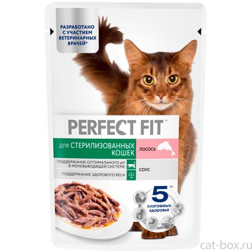 Влажный корм в паучах PERFECT FIT с лососем в соусе для стерилизованных кошек разработан по специальной рецептуре для контроля здоровья кошек, прошедших стерилизацию.