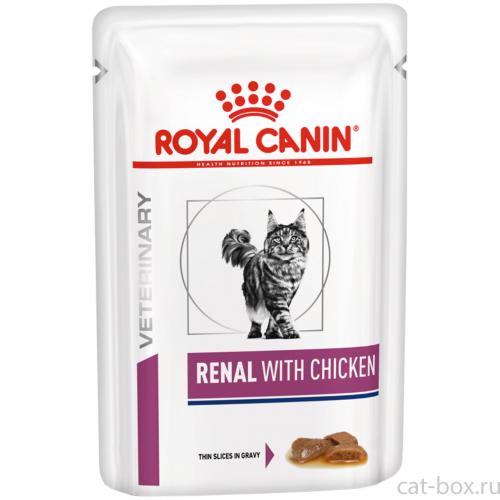Влажный корм ROYAL CANIN RENAL WITH CHICKEN (РЕНАЛ С КУРИЦЕЙ), мелкие кусочки в соусе - полнорационный диетический корм для взрослых кошек для поддержания функции почек при хронической болезни почек. Пониженное содержание фосфора и умеренное количество белка помогают поддерживать функции почек. Специально разработанный ароматический профиль помогает удовлетворить особые вкусовые предпочтения кошки.