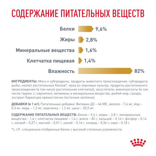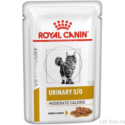 Влажный корм ROYAL CANIN(R) URINARY S/O MODERATE CALORIE (УРИНАРИ С/О МОДЕРЕЙТ КЭЛОРИ), мелкие кусочки в соусе - полнорационный диетический корм для взрослых кошек, склонных к набору лишнего веса, способствующий растворению струвитных камней и предотвращению их повторного образования за счет подкисления мочи и низкого содержания магния. Формула помогает поддерживать оптимальный вес кошки за счет умеренной калорийности.