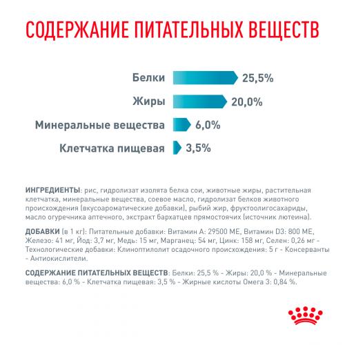 Корм Hypoallergenic Feline содержит комплекс Intensive Colour, обогащенный L-тирозином, который поддерживает интенсивность естественного окраса шерсти.
