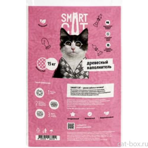 Древесный наполнитель Smart Cat мгновенно впитываетвлагу и надежно устраняет неприятные запахи.