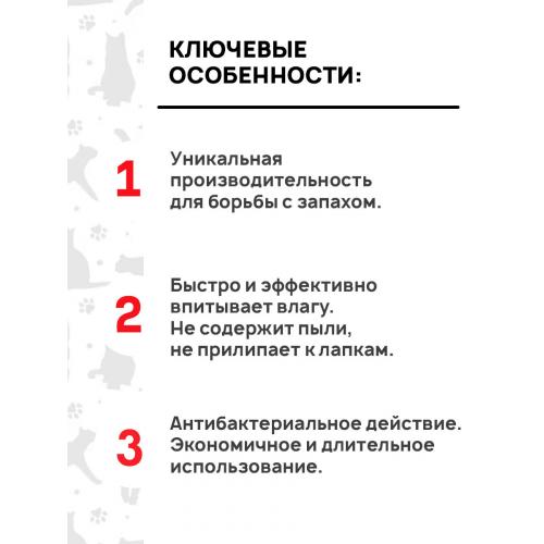 Размер гранул позволяет обеспечить поверхностное впитывание и формирование комочка, который легко удаляется, не прилипая ко дну лотка. Наполнитель не пылит и не прилипает к лапкам.