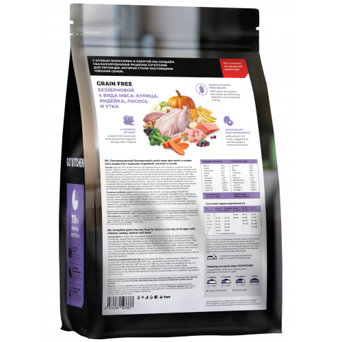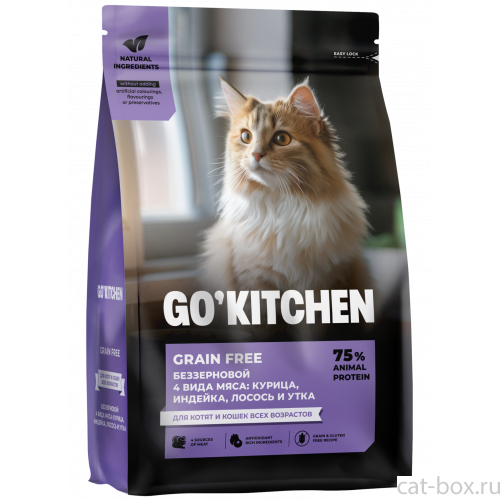Go`Kitchen Беззерновой корм для котят и кошек всех возрастов с курицей, индейкой, лососем и уткой, GRAIN FREE ADULT 4 Meat Recipe, 0.4кг