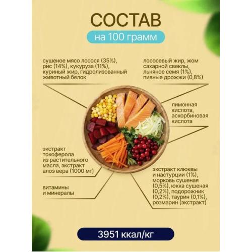 Натуральная основа рациона представлена отборным лососем — ценным источником легкоусвояемого белка и полезных Омега-3 и Омега-6 жирных кислот. Они способствуют поддержанию эластичности кожи, блеска шерсти и активности животного.